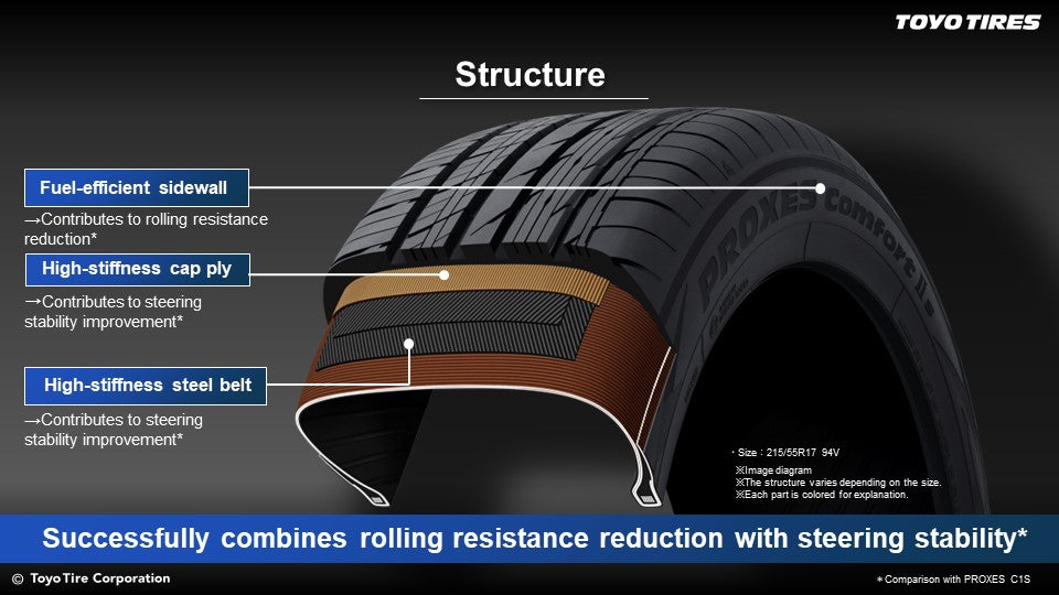 PROXES Comfort IIs 是一款追求高品质巡航并提升环保性能的高级舒适轮胎。在设计胎面花纹时,东洋轮胎采用了独特的轮胎设计平台技术 T-MODE,采用了在胎面花纹内划分功能的不对称花纹。